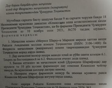 Маркази шарқшиносӣ ва мероси хаттии назди Раёсати Академияи миллии илмҳои Тоҷикистон иттилоъ медиҳад, ки маҷаллаи илмии “Мероси Шарқ”, (аз 02.03.2026) ба Феҳристи маҷаллаҳои илмии тақризшавандаи Ҷумҳурии Тоҷикистон ворид гардид.